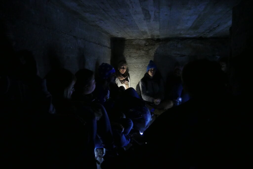 Vi hukar oss ner, kryper ihop. Det är mörkt, trångt och ganska kvavt. Vi sitter tätt intill varandra, knä mot knä. Jag gör mitt bästa för att vika in benen under mig. Känner redan att det börja göra lite ont. Ryggen skrapar mot den skrovliga betongväggen bakom mig. ”Varför tog jag en svart tröja just idag?” hinner jag tänka.