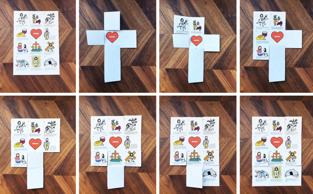 Skriv ut dokumentet dubbelsidigt (det går att skriva ut enkelsidigt också men det blir lite lättare att vika upp korset om siffrorna på baksidan finns med). Klipp längs de heldragna linjerna. Vik längs de streckade linjerna. Då bildar pappret ett kors som när det viks upp i rätt ordning berättar påskens budskap.